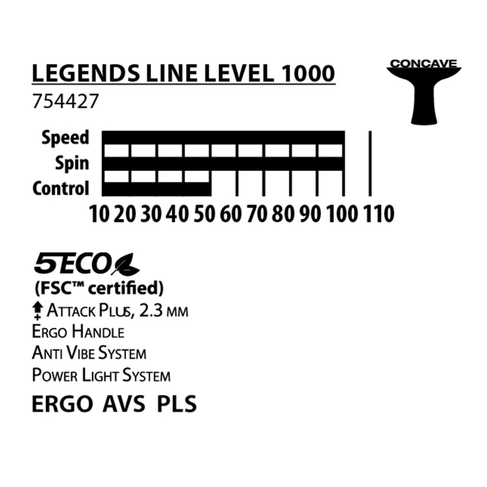Der "Legends 1000 FSC" vereint zahlreiche Technologien und eine exklusive Ausstattung in sich und ist ein absoluter Premiumschläger für den anspruchsvollen Spieler mit Spielstärke vom ambitionierten Freizeitspieler bis hin zum Übergang zum Wettkampfsport. Keine Kompromisse bei der Holz- und Griffqualität, der sehr hochwertige ENERGY-Belag aus dem Hause Schildkröt bietet einen sehr guten Grip für Spiel mit maximalem Spin und überträgt allen denkbaren Spieltechniken sehr effektvoll auf den Ball. Der zwischen Belag und Holz befindliche dicke 2,3mm starke Schwamm generiert ein extrem hohes Maß an Power, schnellere Ballgeschwindigkeiten bei gleichem Krafteinsatz sind der Vorteil gegenüber einem dünneren und somit preiswerten herstellbaren Schwamm. Der ERGO-Griff mit abgerundetem, fließendem Übergang vom Griff zum Schlägerblatt liegt deutlich besser in der Hand als klassische Schläger und vermeidet Druckstellen am Zeigefinger. Diese im Wettkampfsport etablierte Technologie erhält hiermit Einzug in den Bereich der Freizeit-Komplettschläger und ermöglicht zudem schnellstmögliches Umgreifen von Vor- auf Rückhand (und umgekehrt), ein klarer Pluspunkt bei schnellen Tischtennis-Duellen. Auch die PLS-Technologie ("Power Light System") fällt sofort ins Auge: dank der transparenten Linse kann man durch den hohlen Schlägergriff hindurchschauen. Diese Konstruktion sorgt dafür, dass der Schläger leichter und kopflastiger wird, das Resultat ist ein sehr angenehmes Handling und optimierte Power. Das eingebaute "AVS" (Anti Vibrations System - 2 schockabsorbierende PU-Schaum Einlagen unter jeder der beiden Griffschalen) zwischen Blatt und Griff reduziert Vibrationen und Schwingungen spürbar und ermöglicht so ein ermüdungsfreieres Spiel bei viel Kontrolle.