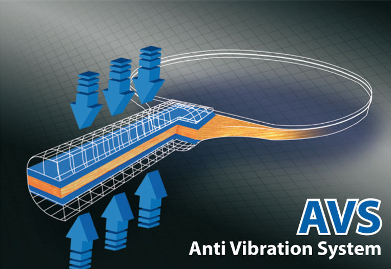 Die ebenso eingebaute AVS-Technologie (Anti Vibrations System) zwischen Blatt und Griff reduziert Vibrationen und Schwingungen spürbar und ermöglicht so ein ermüdungsfreieres Spiel bei viel Kontrolle und optimaler Rückmeldung.