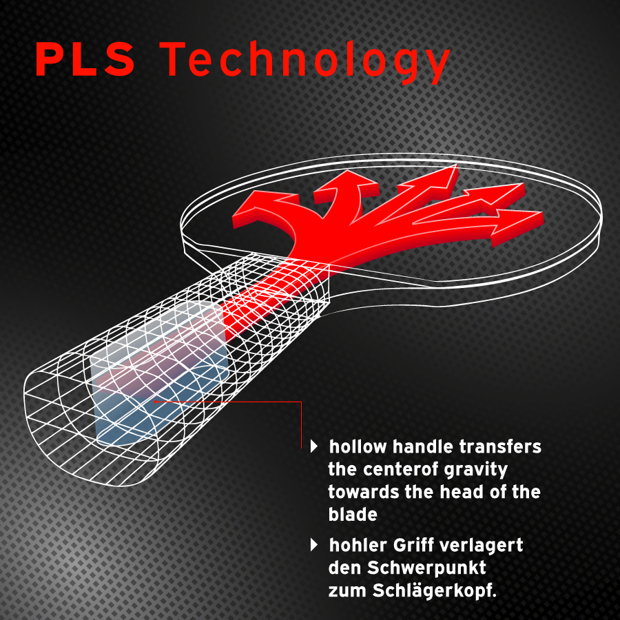 Der hohle Griff des Power Light System (PLS) macht den Schläger leichter und verlagert den Schwerpunkt zum Schlägerkopf. Das bringt mehr Power und Geschwindigkeit und wirkt sich positiv auf das Spiel aus - bei hervorragendem Ballgefühl.