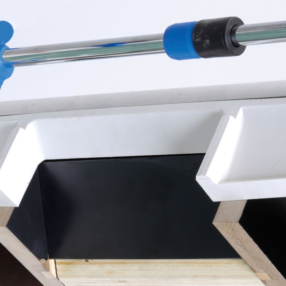 Das gehärtete und sandgestrahlte Glasspielfeld mit weißen Spielfeldlinien ist besonders griffig. Dank aufgesetzter Ecken bleiben keine Bälle liegen und der Spielfluss wird nicht unterbrochen. Die Tor-Außenwände sind mit Fiberglas verstärkt und verbessern das Abprall-Verhalten des Balls. Durch Fiberglas verstärkte Tor-Innenwände prallt kein Ball zurück ins Spielfeld.