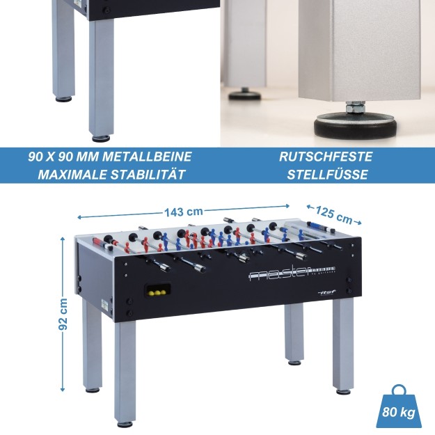 Das Modell ITSF Master Champion, hergestellt von Garlando, Made in Italy. Garlando ist offizieller Partner des Weltverbandes ITSF und gehört mit über 70 Jahren Erfahrung zum weltweit führenden Produzenten professioneller Fußballkicker. Nationale sowie internationale Meisterschaften werden auf dem ITSF Master Champion ausgetragen.