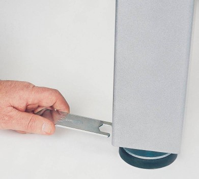 Die robuste Bauweise der Modellreihe mit den 90 × 90 mm massiven Metallbeinen sorgt für ein Höchstmaß an Stabilität. Bei Bodenunebenheiten kann der Tisch durch die höhenverstellbaren und rutschfesten Stellfüße perfekt einjustiert werden.