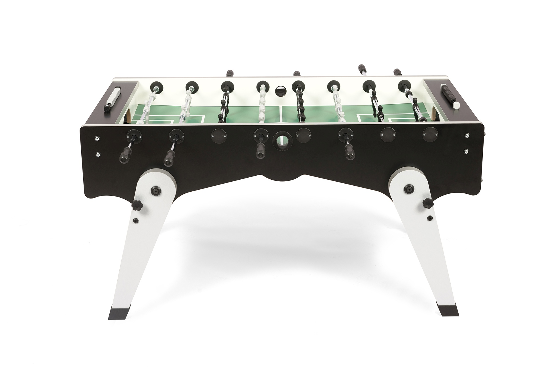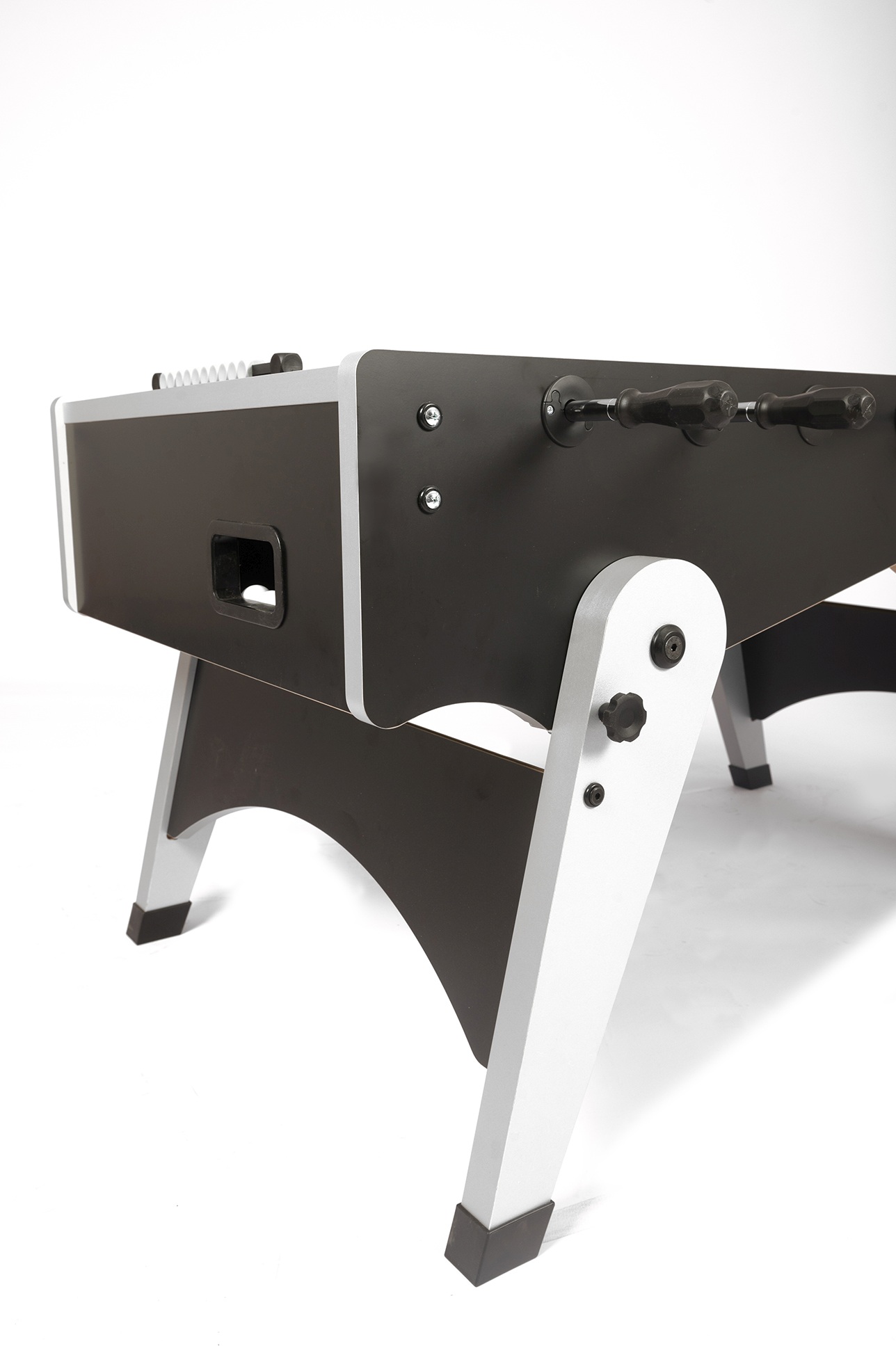 Das klassisch grüne Spielfeld mit weißen Spielfeldlinien ist aus melaminbeschichteten 12 mm Laminat und hat hochgezogene Ecken, wodurch die Bälle nicht in den Ecken liegen bleiben. Das Spielfeld ist in einen 25 mm soliden Korpus eingefasst.