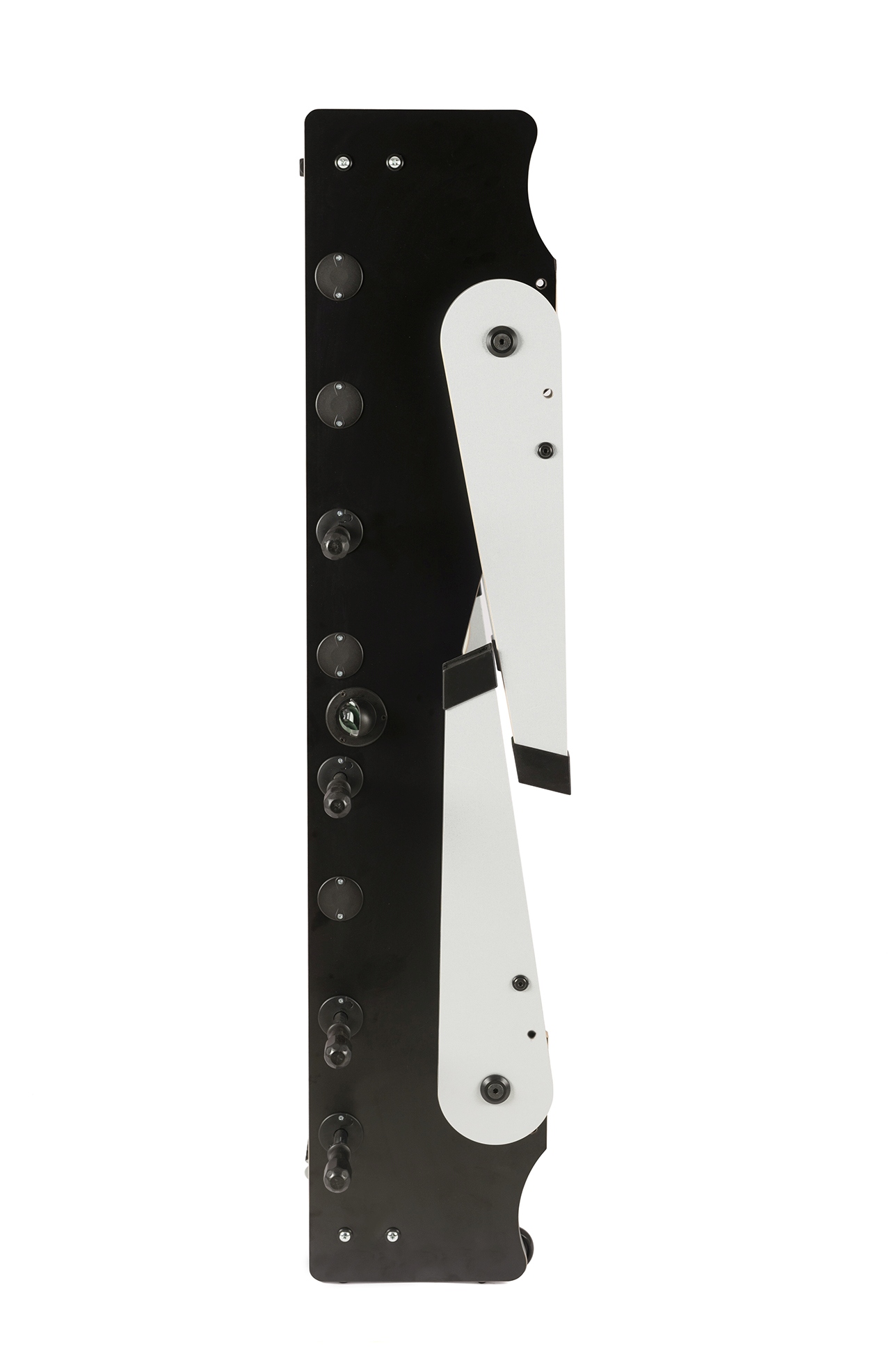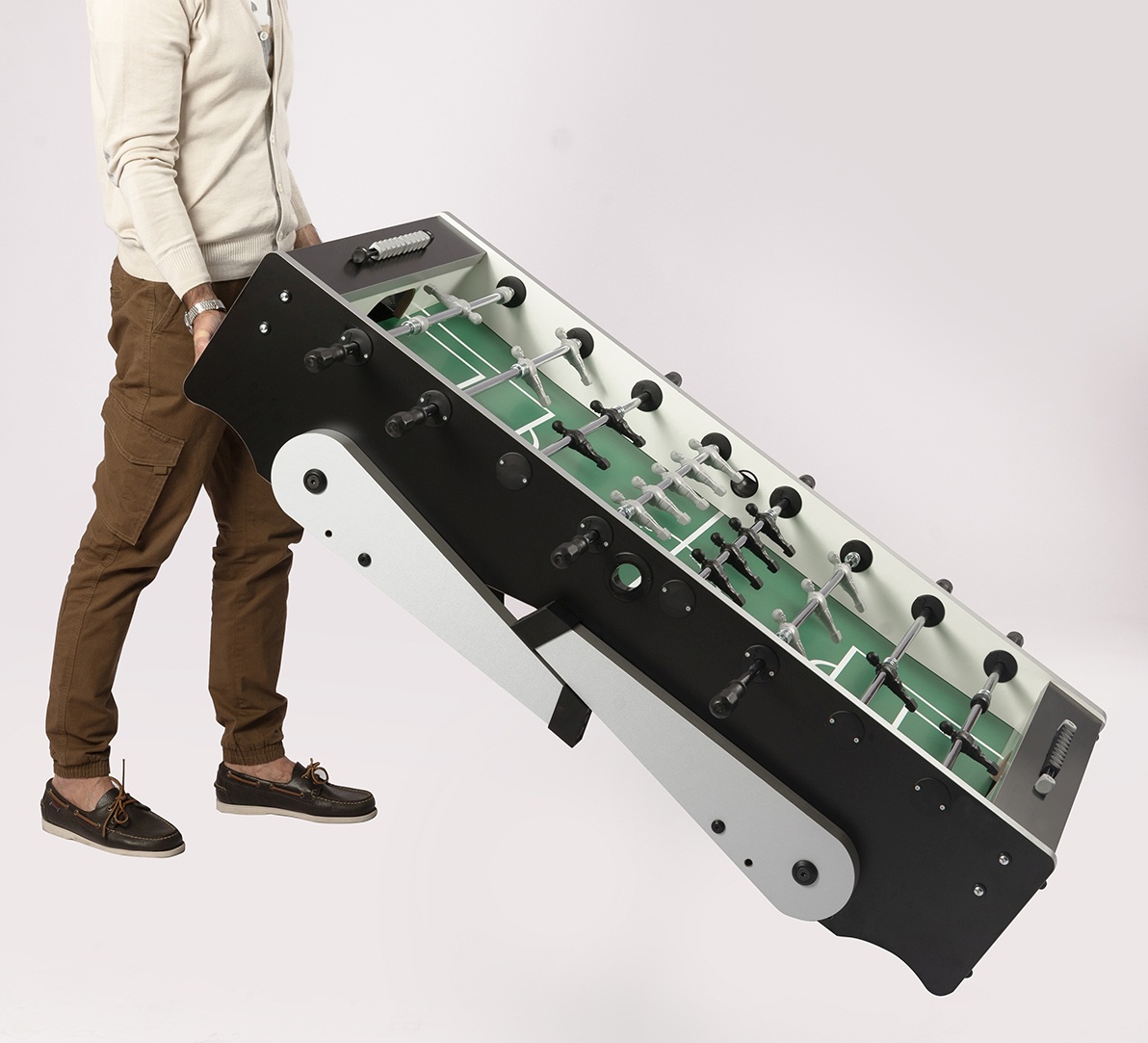 Mit einer Gesamthöhe von 74 cm ist er 15 cm niedriger als die gängigen Tischkicker. So eignet sich dieser Tisch ideal für zuhause, Kinder- und Jugendeinrichtungen. Mit nur einen Handgriff können die Tischbeine eingeklappt werden. Zudem ist der Tisch mit praktischen Transportrollen versehen. Dadurch kann der Tischkicker mühelos von einer Person bewegt und platzsparend hochkant abgestellt werden. Der Tisch ist ausgestattet mit Teleskopstangen, welche wir speziell für den Spielbetrieb in Kindereinrichtungen empfehlen, da die Stangen beim Spielen nicht aus dem Korpus herausragen. Diese für Kinder ungefährliche „Safety“ Version wird als SA-Ausführung bezeichnet.