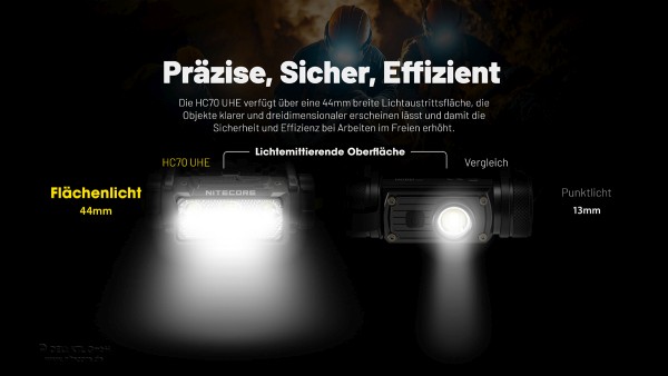 Die Nitecore HC70 UHE ist mit 6 Matrix-Design NiteLab UHE Led´s ausgestattet. Das TrueVision Linsen System sorgt für eine homogene Ausleuchtung in jeder Leuchtstufe. Die Rotlicht-LED erhält die Nachtsichtfähigkeit.