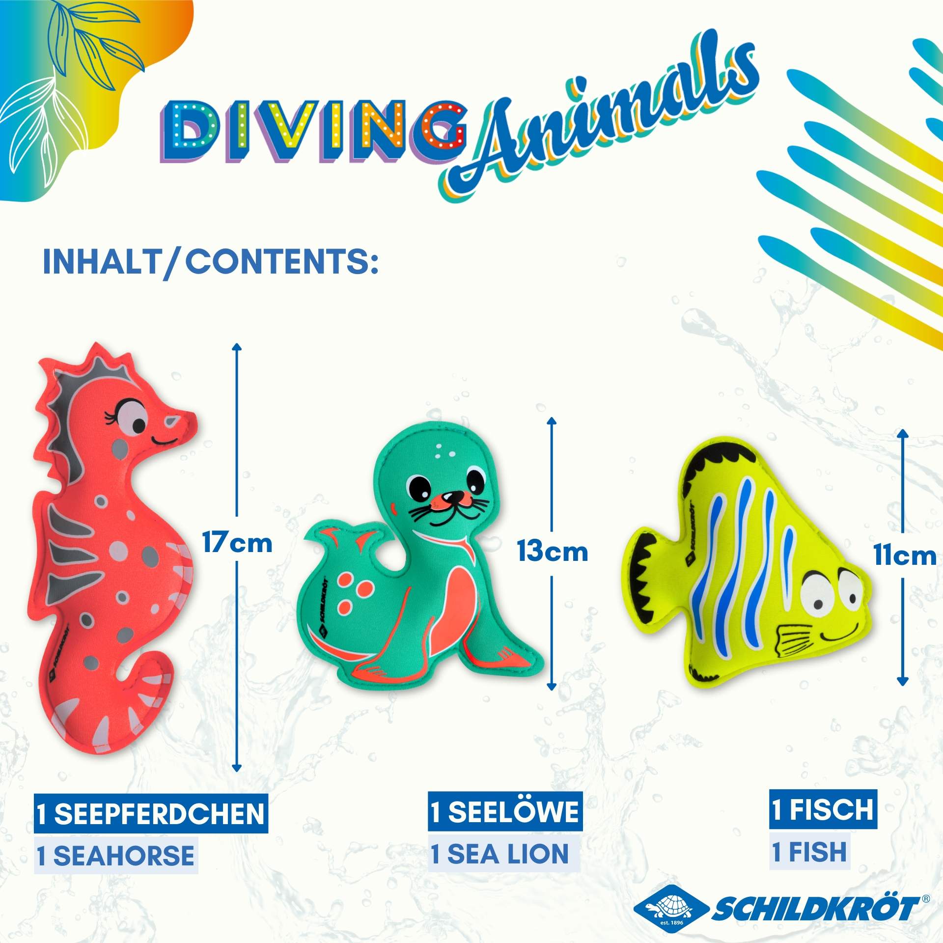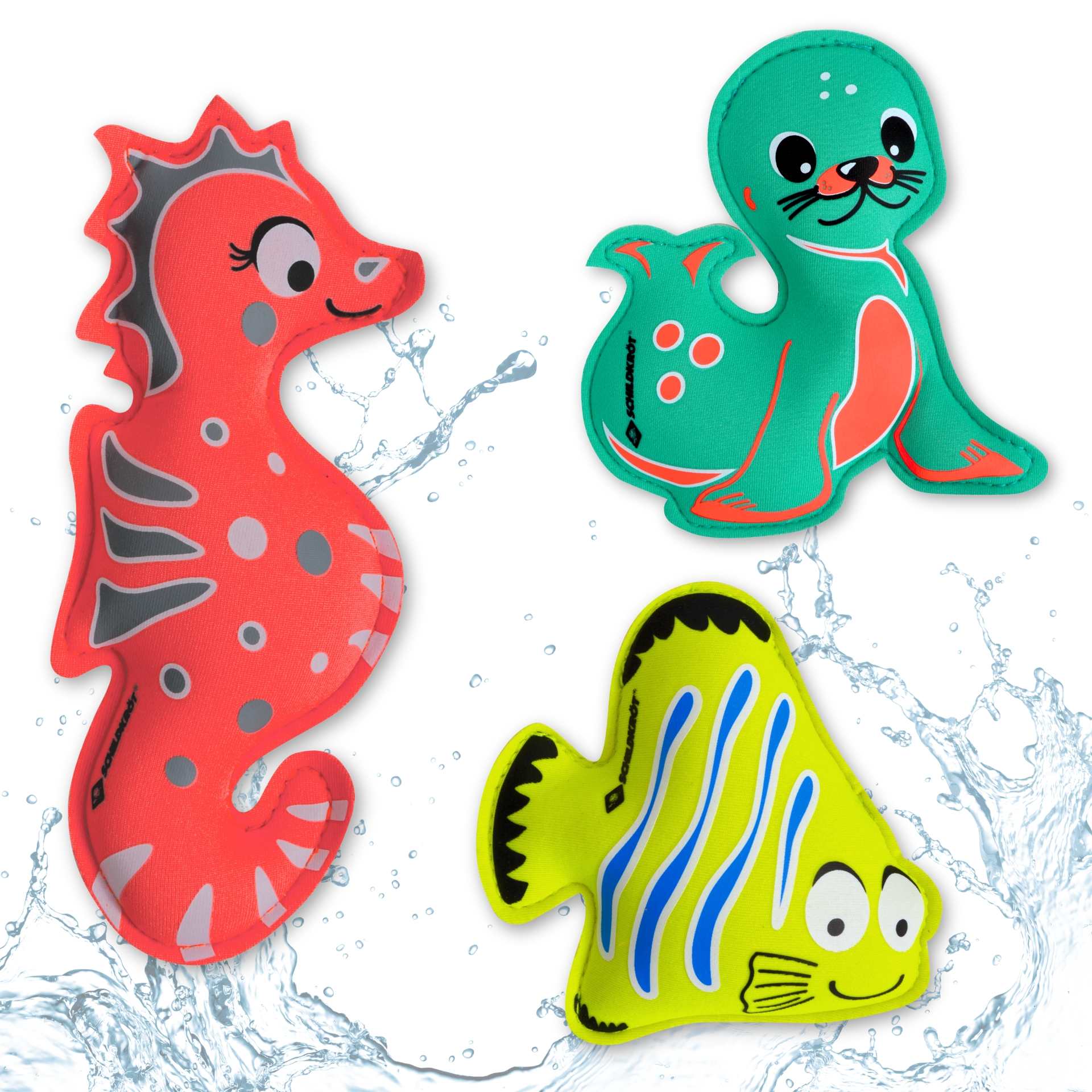 Drei sandgefüllte, süße Tauchtierchen (1 Seelöwe, 1 Seepferdchen, 1 Fisch) mit Neoprenüberzug und guter Verarbeitung.