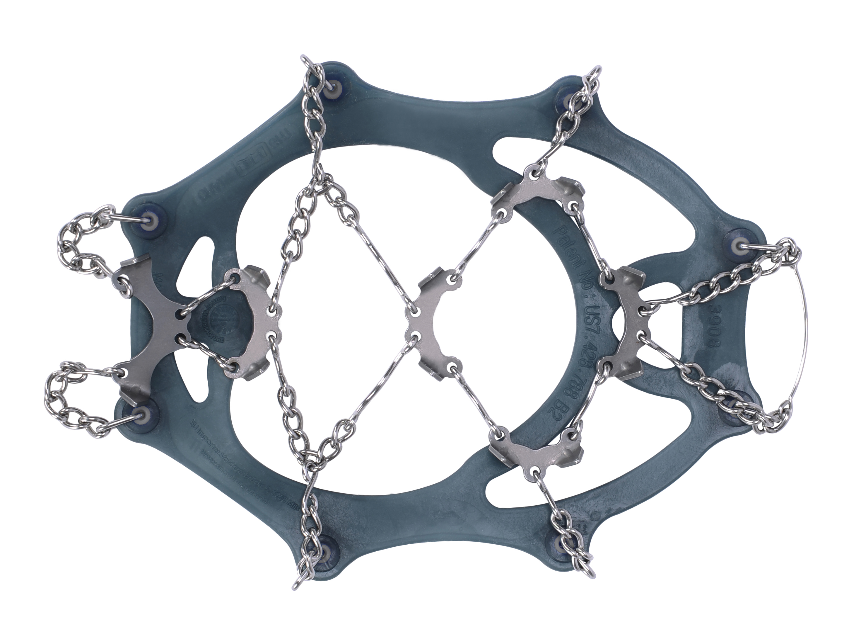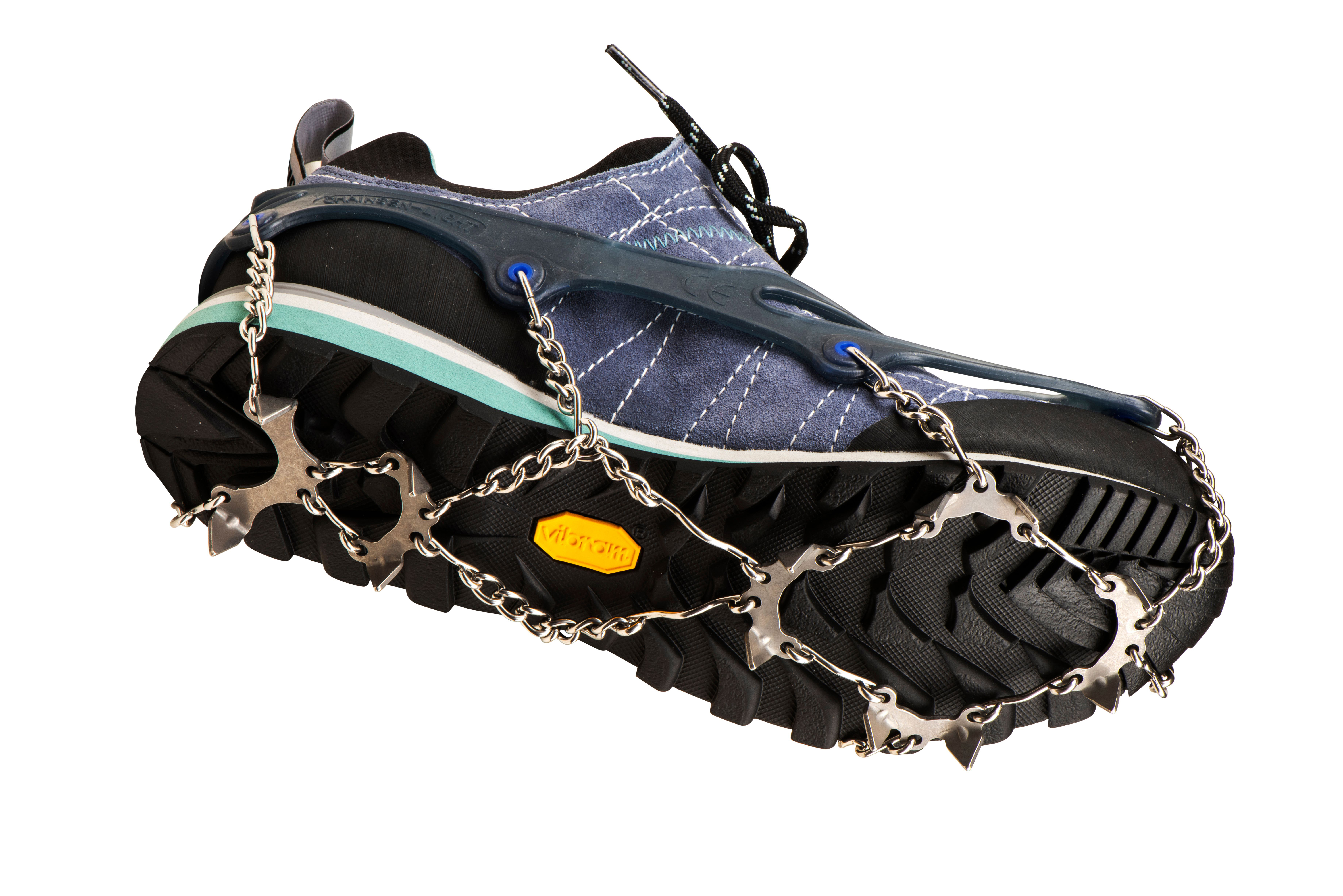 35 % leichter als die 'Pro'-Version. Mit spezieller Legierung und deshalb ideal für den alpinen Einsatz oder Trailrunning. Diese Ketten geben sicheren Halt und passen auf Bergschuhe, isolierte Winterstiefel oder Laufschuhe. Der Frontbügel hält den Schuh sicher fixiert, sogar bei steileren Anstiegen oder im Laufeinsatz. Die 11 Spitzen aus gehärtetem Edelstahl geben besten Halt. Die sehr gut verarbeiteten Ketten können dank Elastomer-Gummi in Sekundenschnelle an- und ausgezogen werden und finden im praktischen Packbeutel in jeder Tasche oder Rucksack problemlos Platz. Super auch im Sommer für die Querung von Altschneefeldern.
