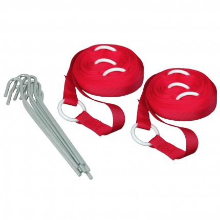 Die zwei Gurtbänder bilden je ein Quadrat mit einer Seitenlänge von 4 m, die im Abstand von 7 m mit den Heringen im Boden verankert werden.