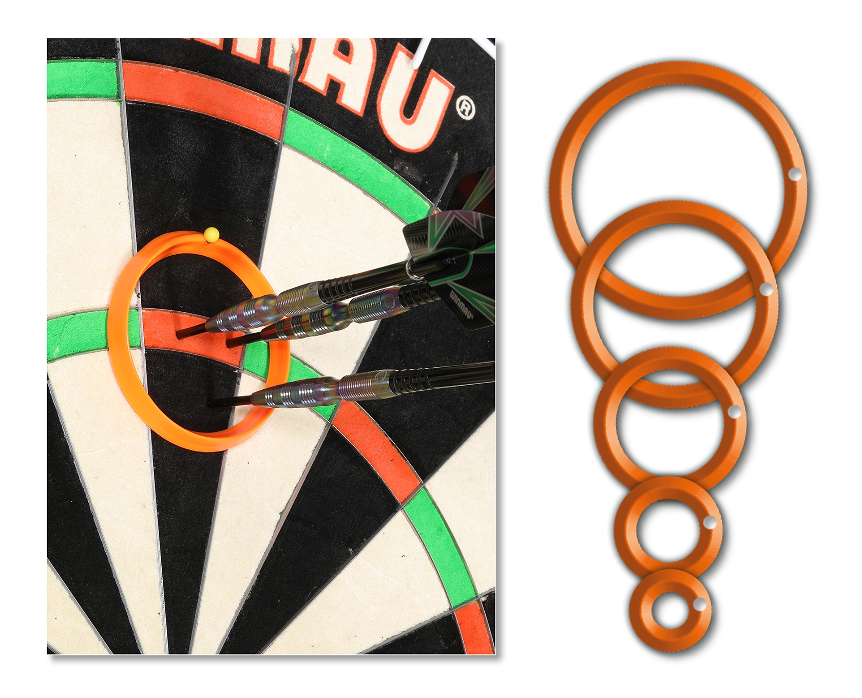 Die Trainingsringe in unterscheidlichen Größen können auf der Dartscheibe an beliebigen Stellen angebracht werden und stellen jeweils das Ziel dar.